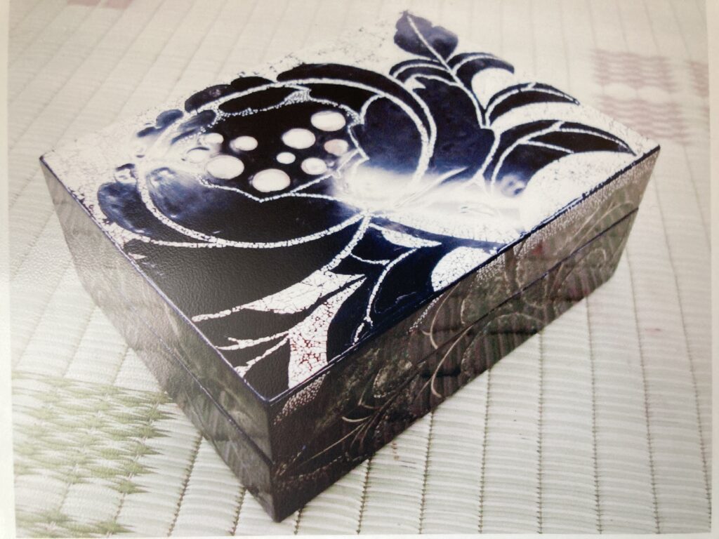漆芸においては白の表現がとても困難です。この小箱では卵の殻と貝を貼って白を表現しています。